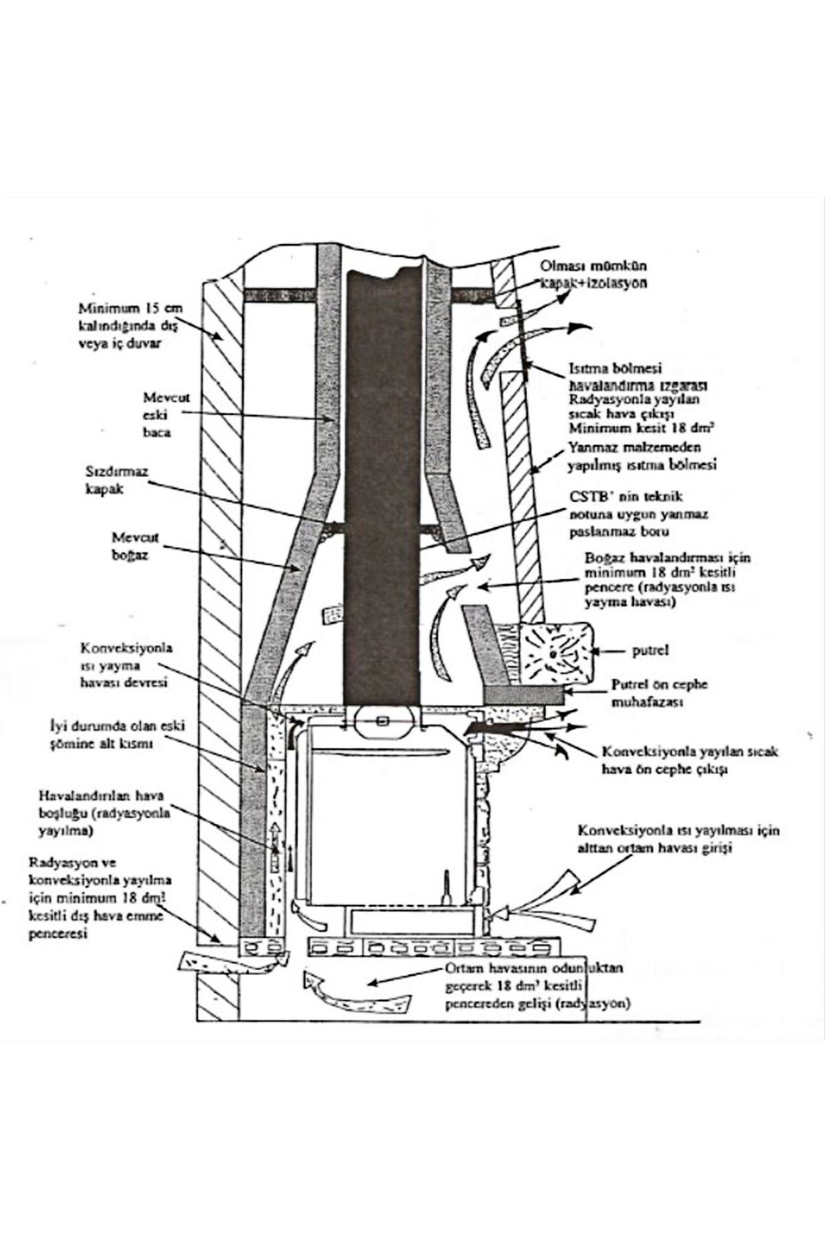 - Mevcut açık şöminenin içine baca bağlantısı ile yerleştirilen turbo şömine hazneleri, ortam havasının hazne çevresinde akması ve ısı transferini sağlamak için döküm hazne üzerine çelik astarla donatılmıştır. Bu şömine haznesi elektriğe bağlı fanla ile kolayca ısı dağıtımı yapabilir. Türbinler odadaki havayı, haznenin alt kısmındaki tribünler yoluyla çeker. Soğuk hava döküm hazne ve çelik astar arasında dolaşarak ısıtılır ve daha sonra haznenin ön üst kısmındaki bölümden tarafından dışarı atılır. Ayrıca hazne üzerinden sıcak hava çıkış bölümleri ile sıcak hava diğer odalara dağıtılabilir.