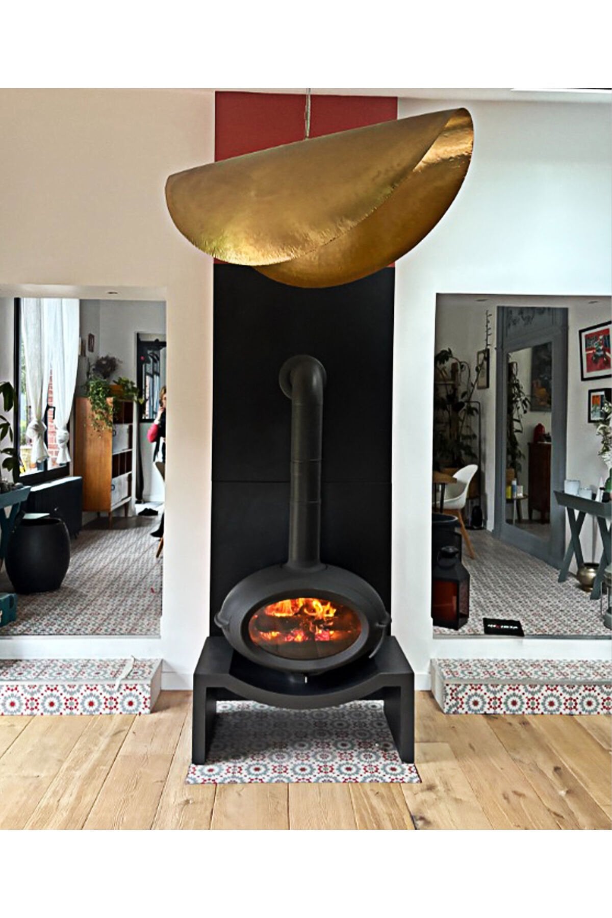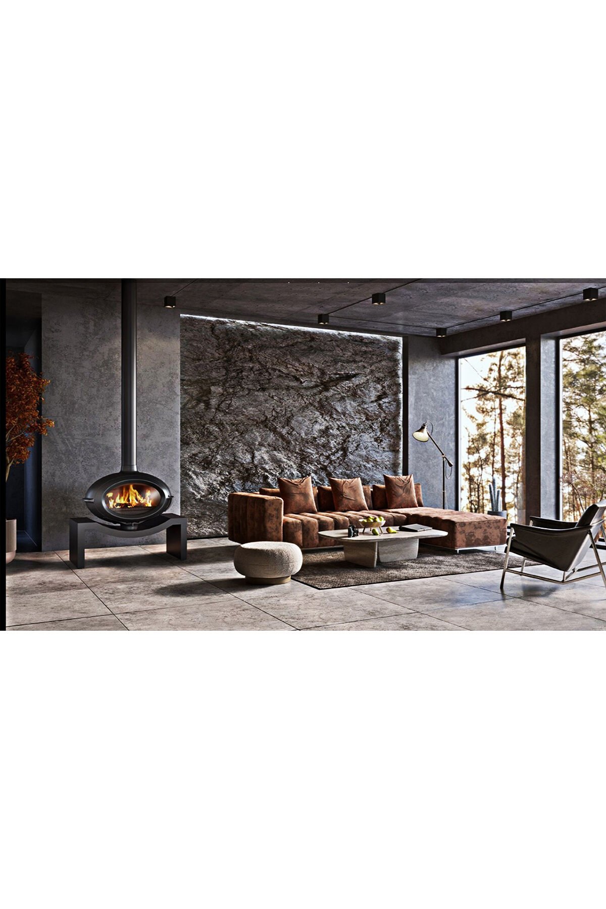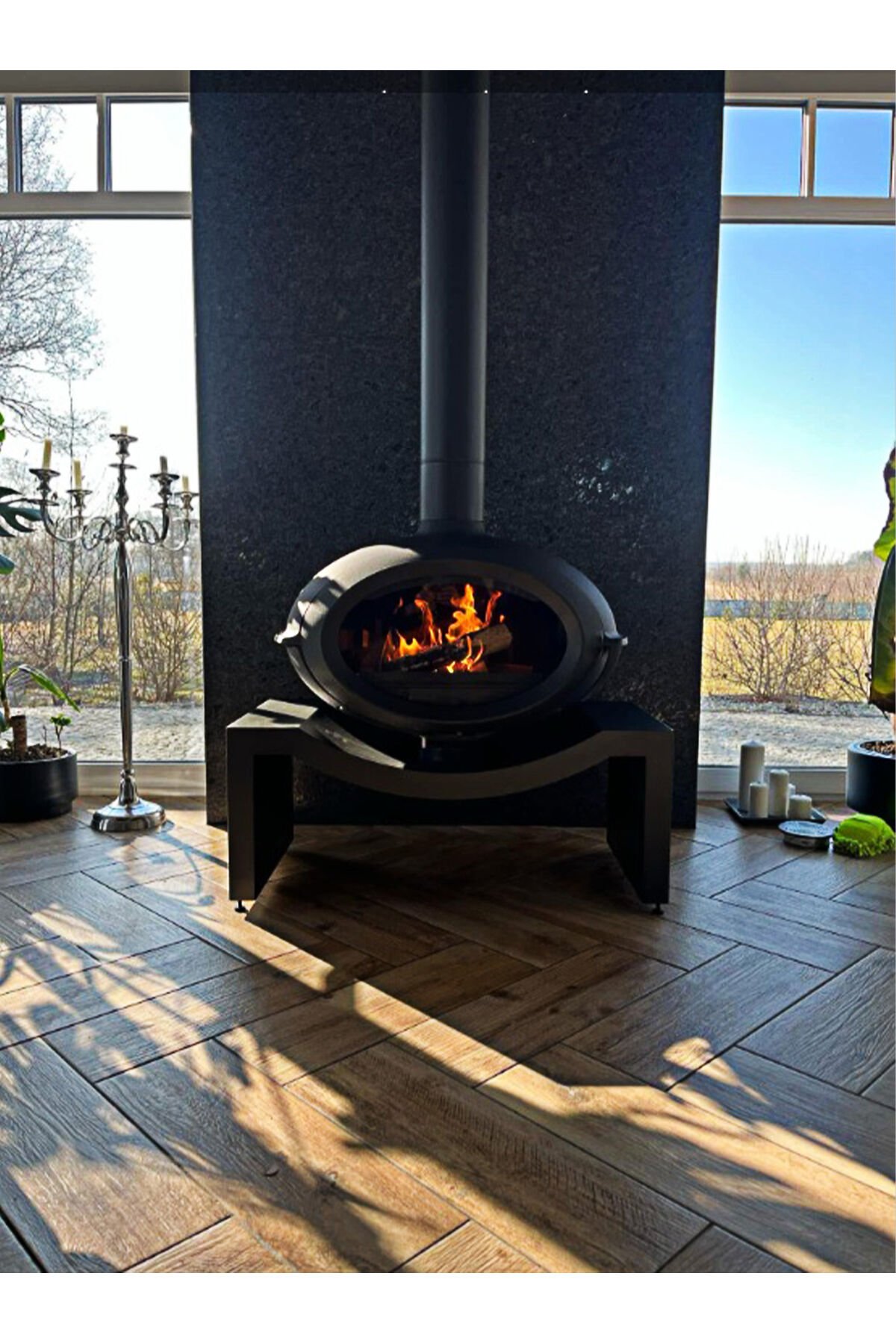 Temiz görünümlü çelik bank, oturma odanızda adeta bir gösteri yapmak için dökme demir sobanın şeklini kucaklıyor.