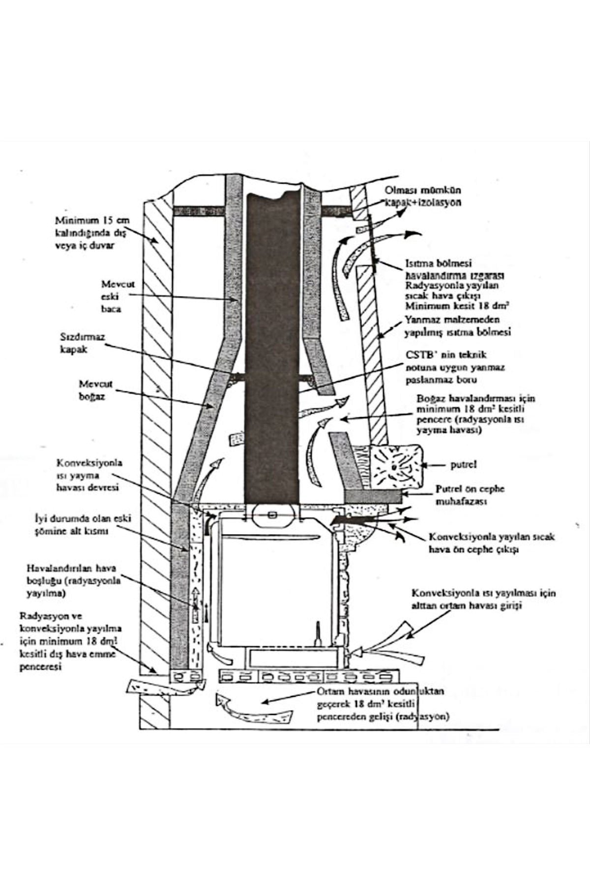 - Mevcut açık şöminenin içine baca bağlantısı ile yerleştirilen turbo şömine hazneleri, ortam havasının hazne çevresinde akması ve ısı transferini sağlamak için döküm hazne üzerine çelik astarla donatılmıştır. Bu şömine haznesi elektriğe bağlı fanla ile kolayca ısı dağıtımı yapabilir. Türbinler odadaki havayı, haznenin alt kısmındaki tribünler yoluyla çeker. Soğuk hava döküm hazne ve çelik astar arasında dolaşarak ısıtılır ve daha sonra haznenin ön üst kısmındaki bölümden tarafından dışarı atılır. Ayrıca hazne üzerinden sıcak hava çıkış bölümleri ile sıcak hava diğer odalara dağıtılabilir.