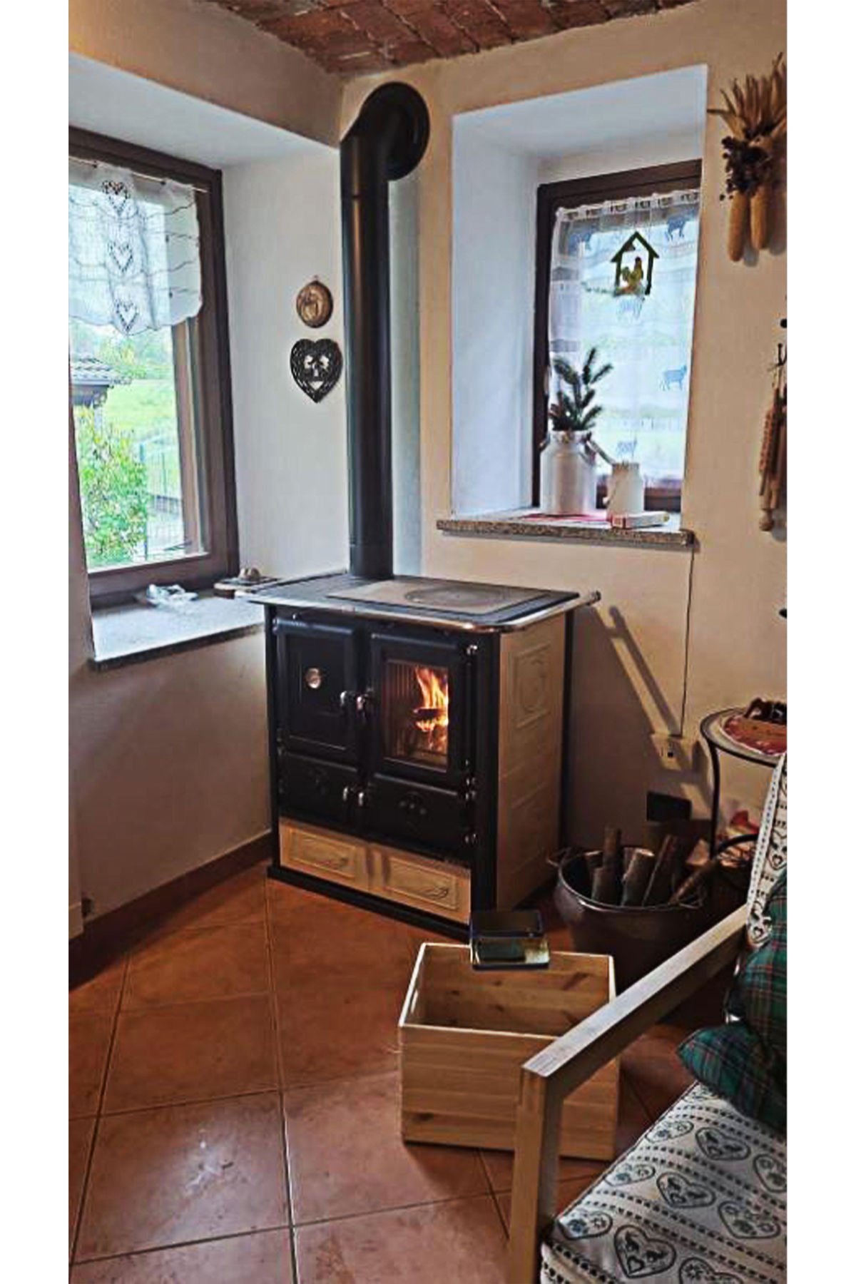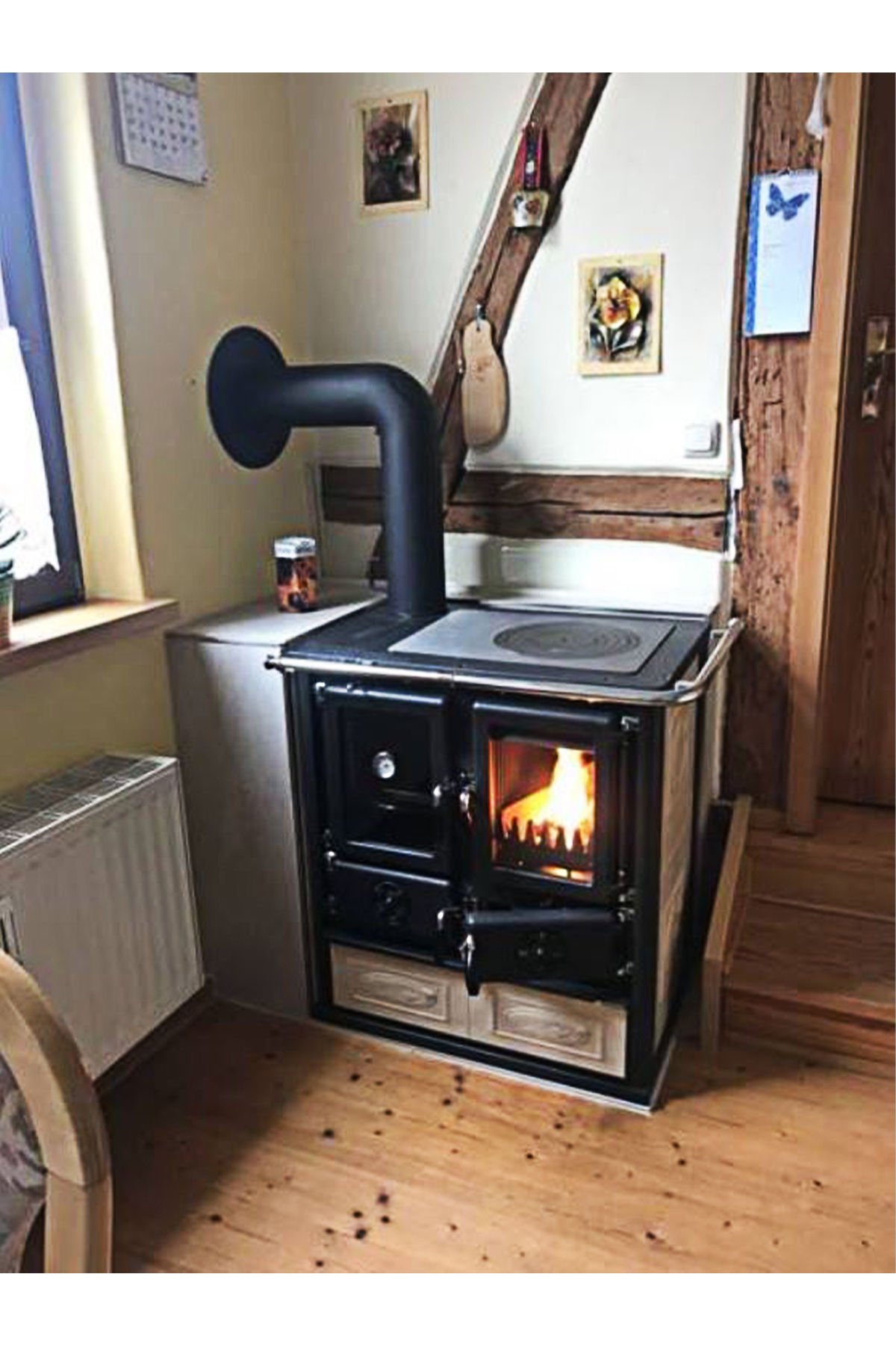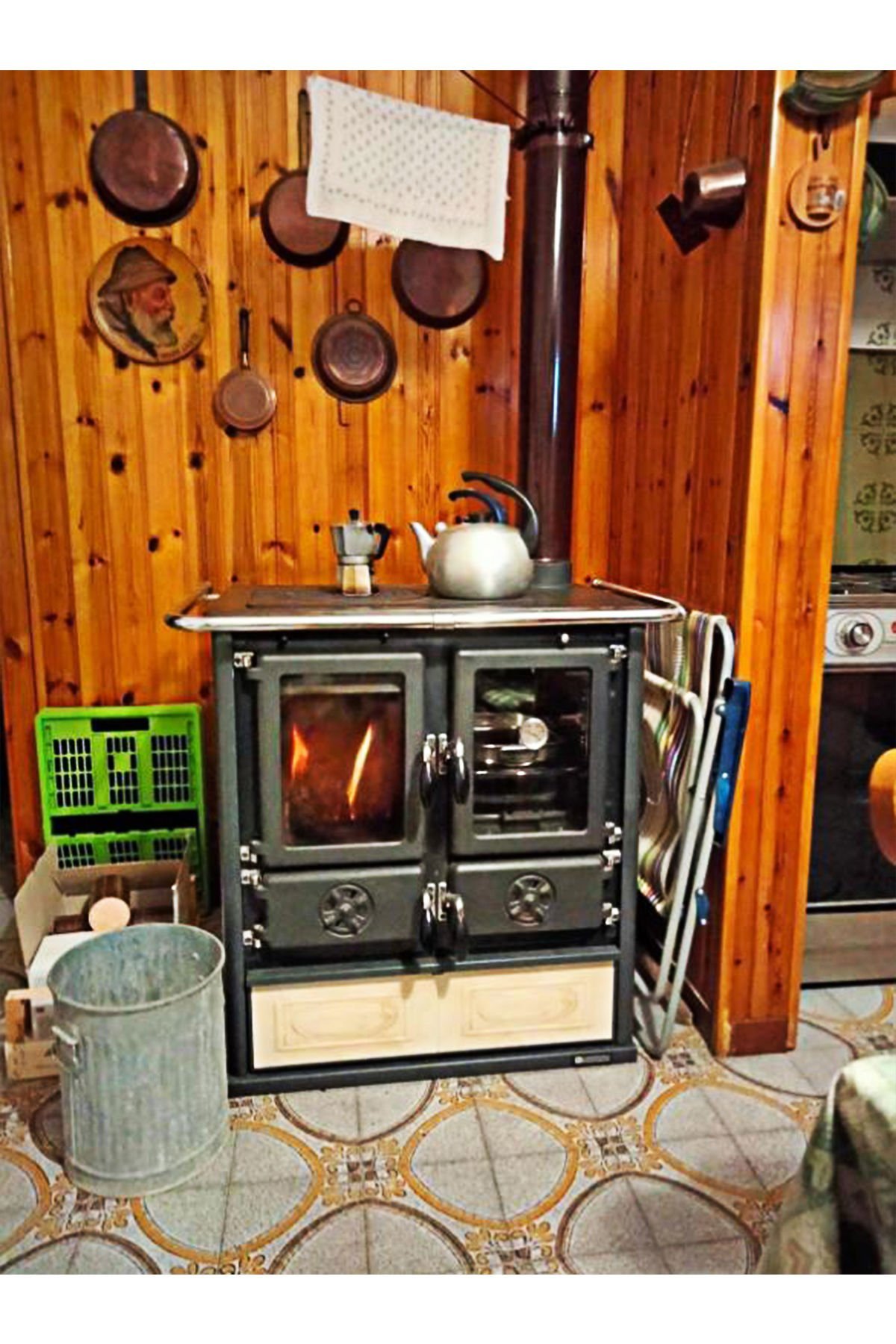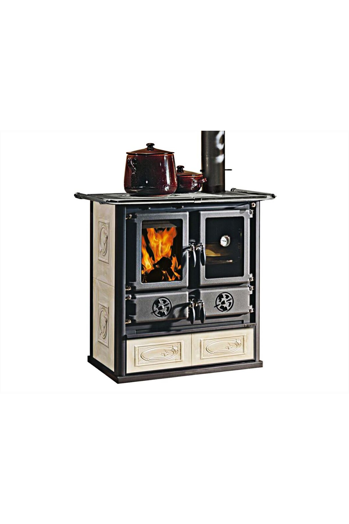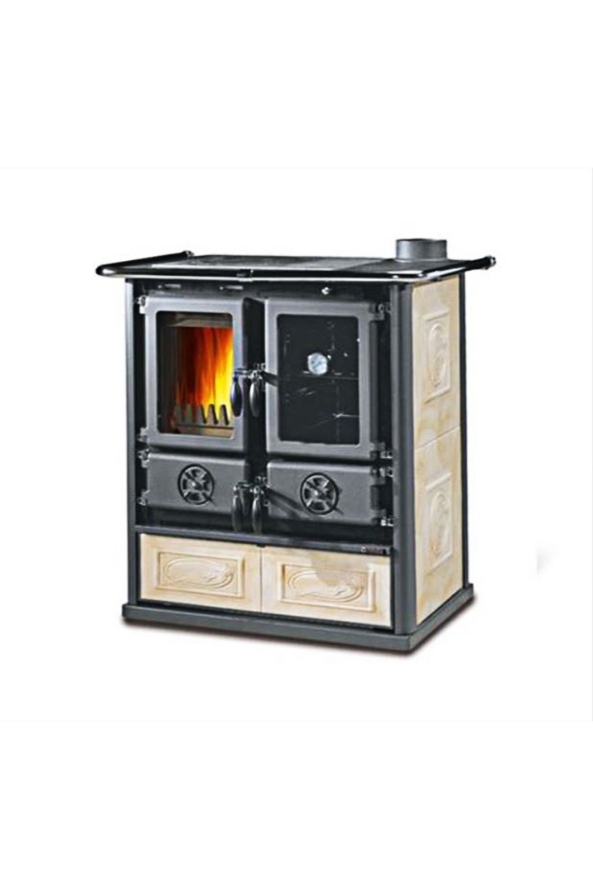 Rosetta BII Krem Kuzine Soba’nın odun kurutma çekmecesi çok geniştir, böylece içine yeterince kütük konulabilir. Bu, yemek pişirirken odun getirme zahmetinden kurtarır. İsterseniz bu bölümü tencereleriniz depolamak içinde kullanabilirsiniz. Rosetta BII Krem Kuzine Soba’nın kalbi olan yanma bölümü, ahşap çekmecenin üzerinde yer alır ve yanında da fırın bölmesi bulunur.