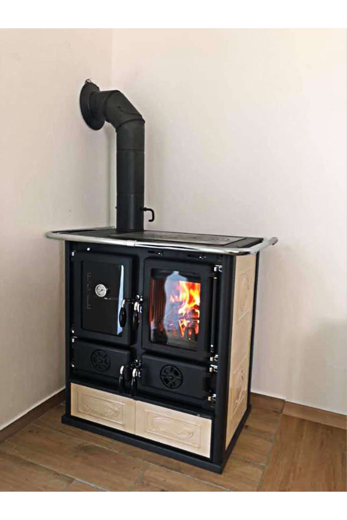 Çerçeve, plaka ve halkalar dökme demirden yapılmıştır ve bu nedenle çok dayanıklıdır. Dökme demir kapılar, Rosetta BII Krem Kuzine Soba'nın sürekli olarak hava geçirmez olmasını sağlar.